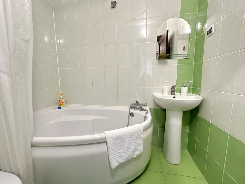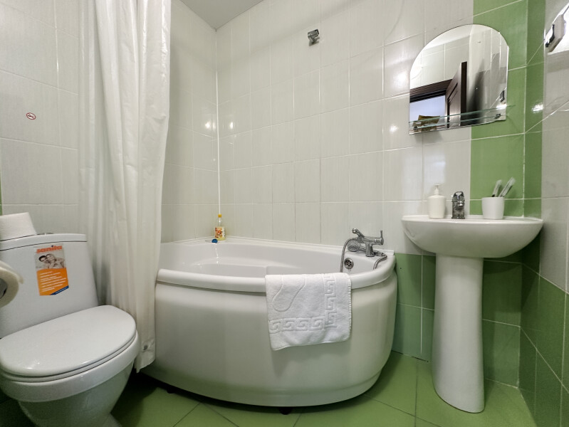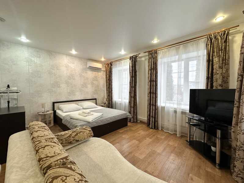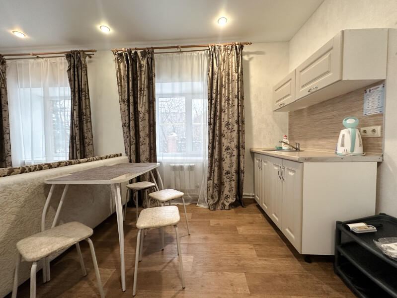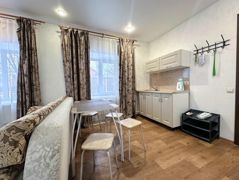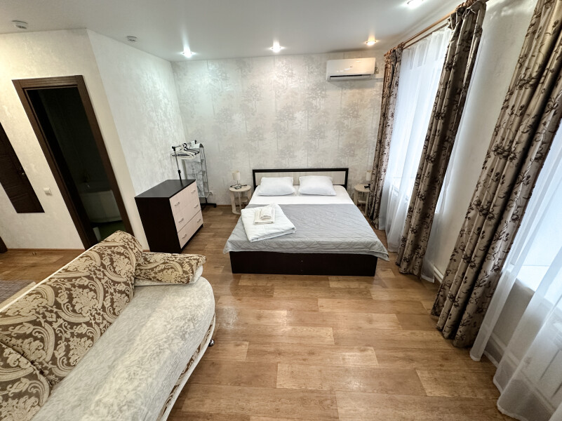 Семейный номер с двуспальной кроватью и двуспальным диваном Номер комфорт, 22м2, оснащен: Мини-кухней: плита, чайник, стол со стульями, вся необходимая посуда. Приятный бонус в виде чая и конфет. Собственная ванная комната с душем. Комплект полотенец. Кондиционер, телевизор и бесплатный wi-fi. Услуги по доставки еды, трансферу, прачечной.