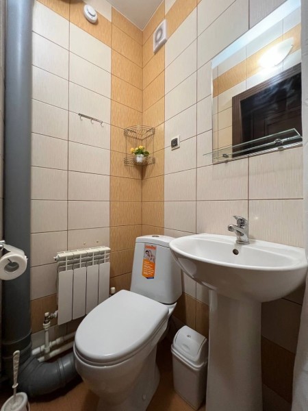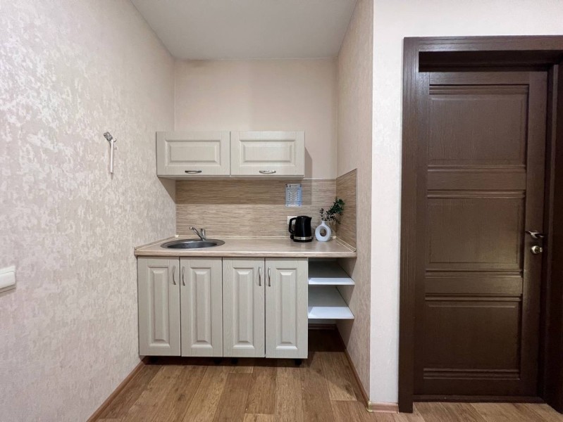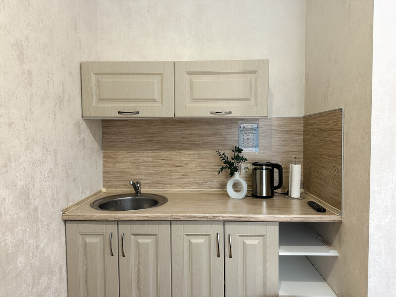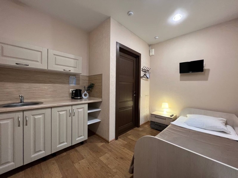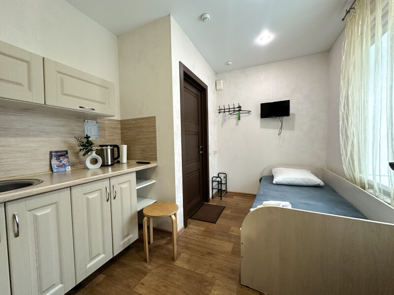 Номер стандарт, 12м2, оснащен мини-кухней: плита, чайник, вся необходимая посуда. Приятный бонус в виде чая и конфет. Собственная ванная комната с душем. Комплект полотенец. Телевизор и бесплатный wi-fi. Услуги по доставки еды, трансферу.