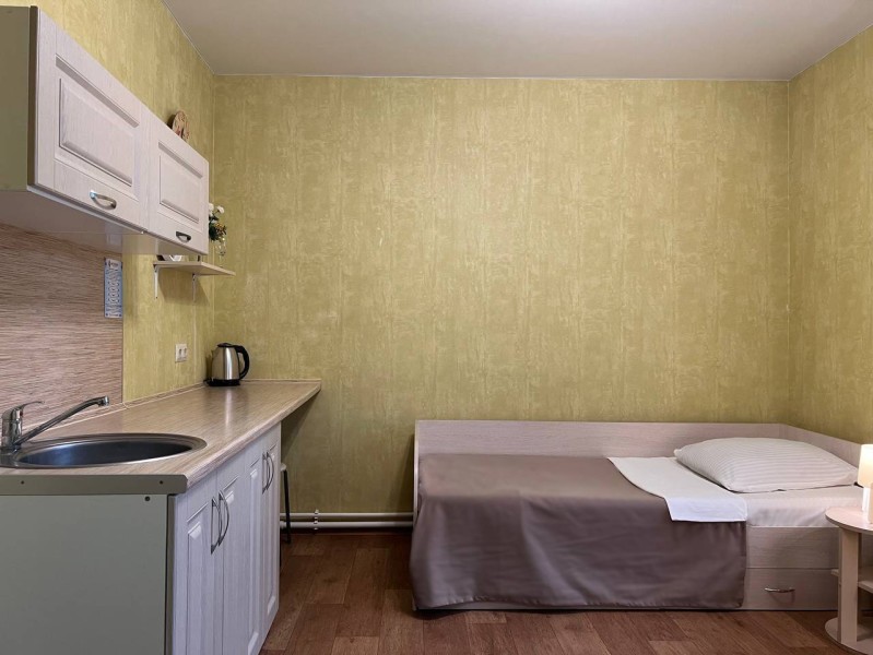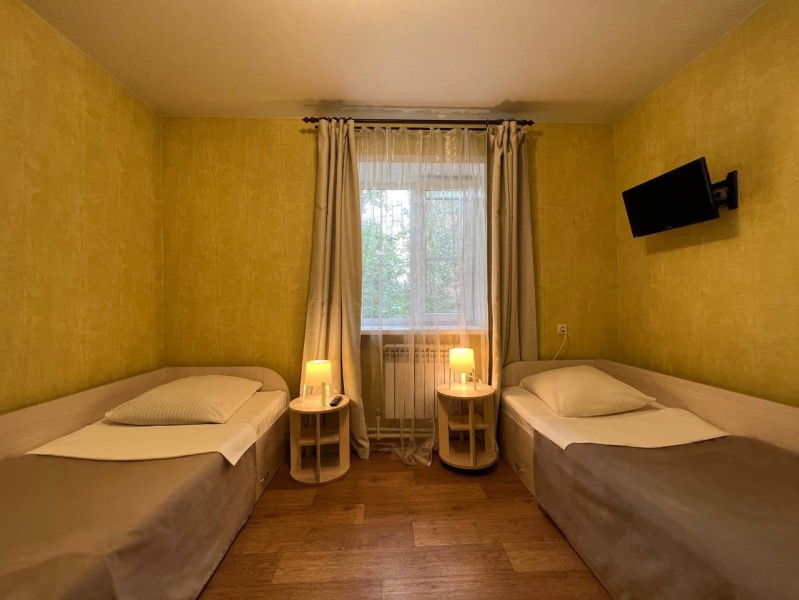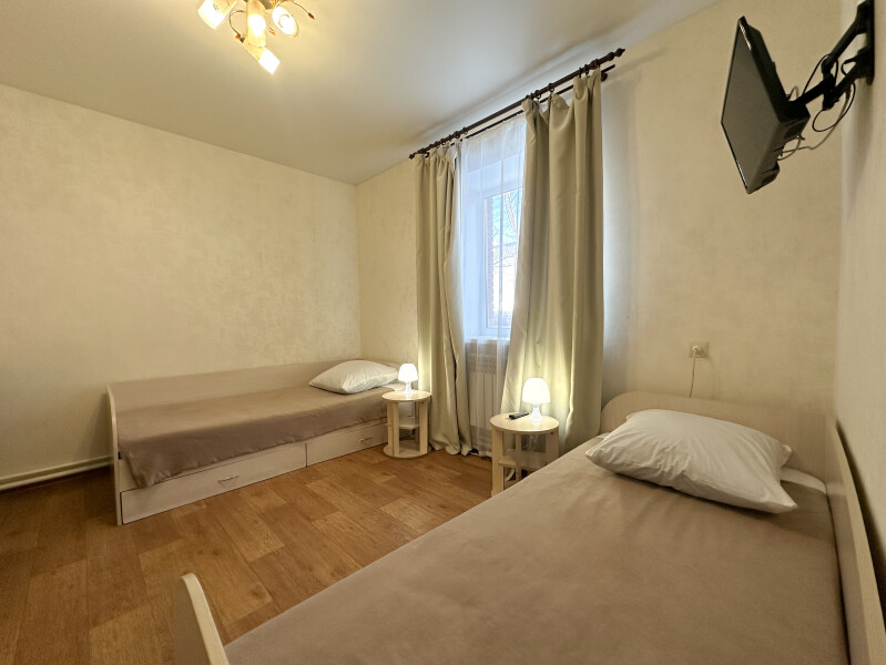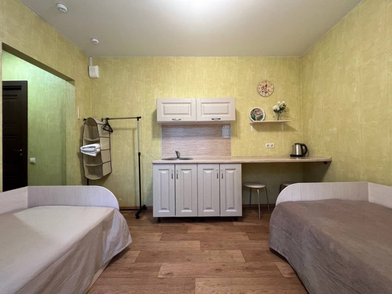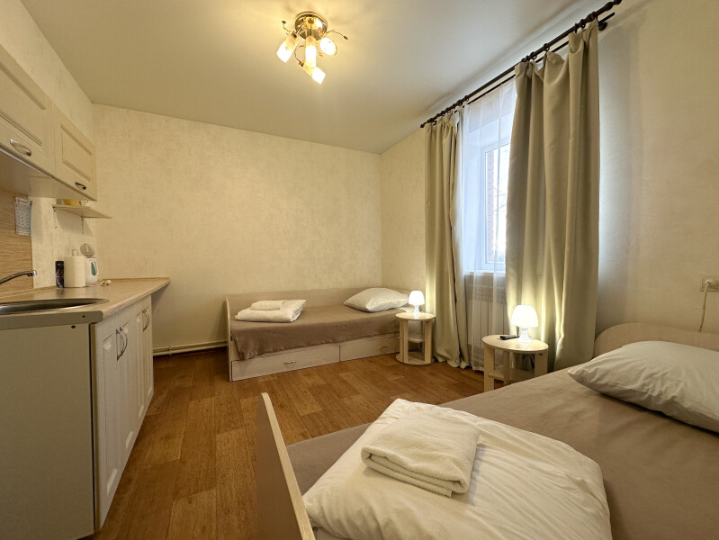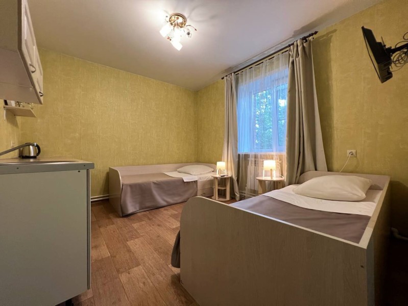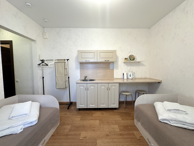 Номер с 2 отдельными кроватями Номер стандарт, 16м2, оснащен: мини-кухней: плита, чайник, вся необходимая посуда. Приятный бонус в виде чая и конфет. Собственная ванная комната с душем. Комплект полотенец. Телевизор и бесплатный wi-fi. Услуги по доставки еды, трансферу, прачечной.