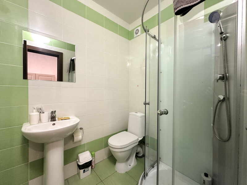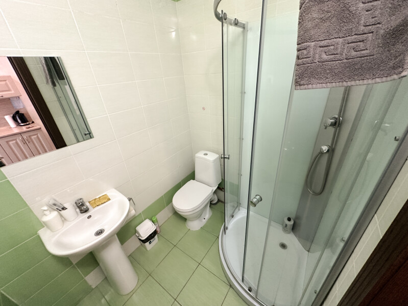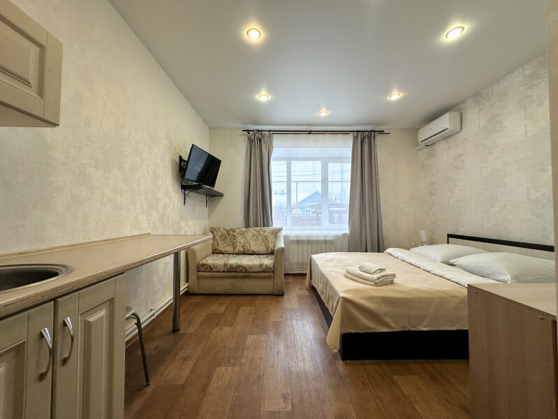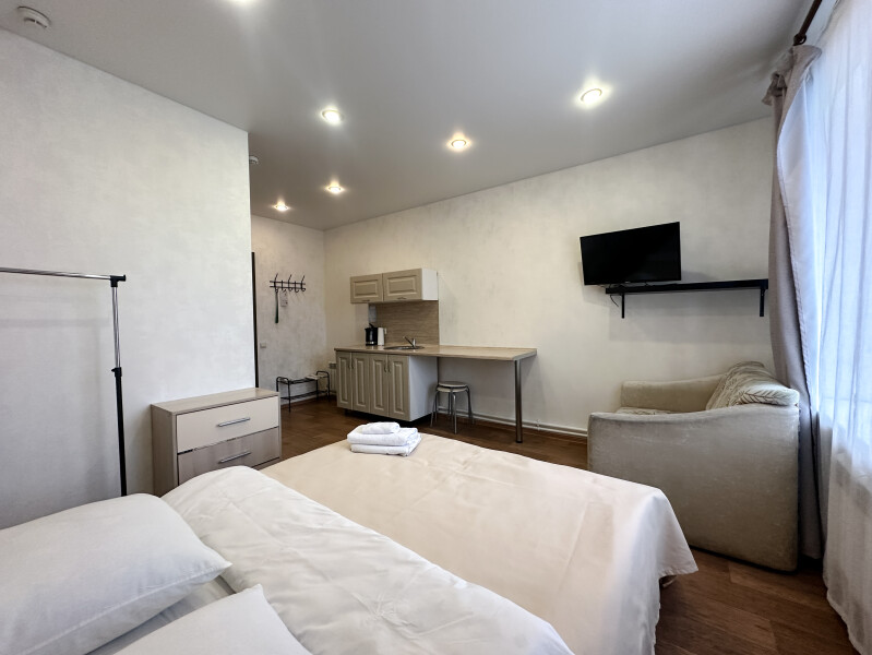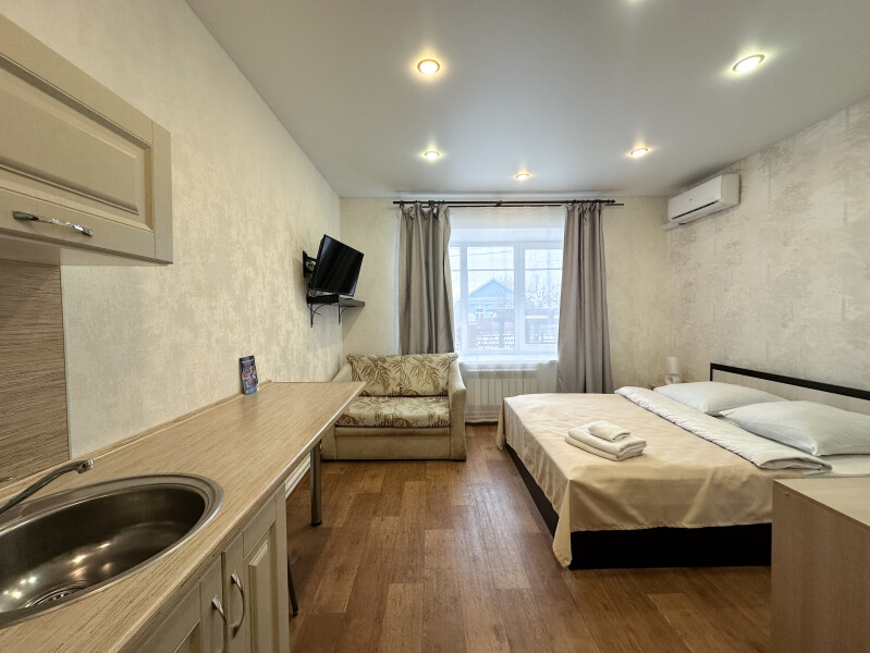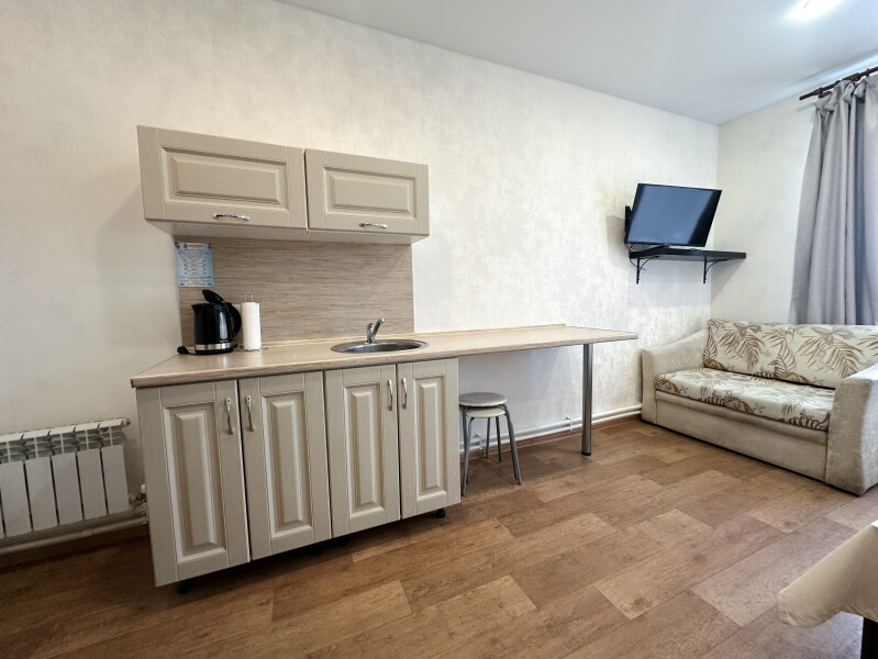 Номер с двуспальной кроватью и односпальным диваном Улучшенный номер, 20м2, оснащен: Мини-кухней: плита, чайник, вся необходимая посуда. Приятный бонус в виде чая и конфет. Собственная ванная комната с душем. Комплект полотенец. Кондиционер, телевизор и бесплатный wi-fi. Услуги по доставки еды, трансферу, прачечной.